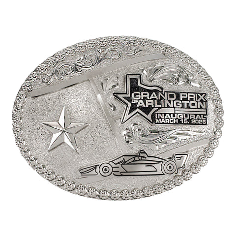 There's no better way to commemorate the Inaugural Grand Prix of Arlington than with this belt buckle! Made by the pros at Montana Silversmith, this belt buckle is made with the highest-quality silver around. Featuring the Inaugural event logo, INDYCAR silhouette, and a star as a nod to Texas, this buckle is a must-have for any collector. Comes in a display box for protection. With a limited run of 50 belt buckles, you don't want to miss out on this!